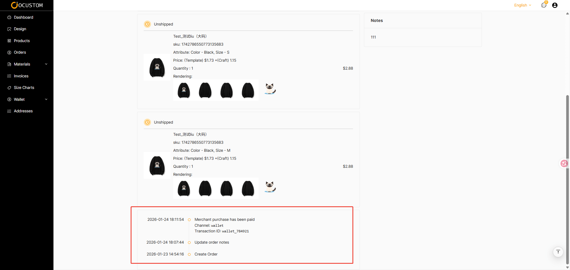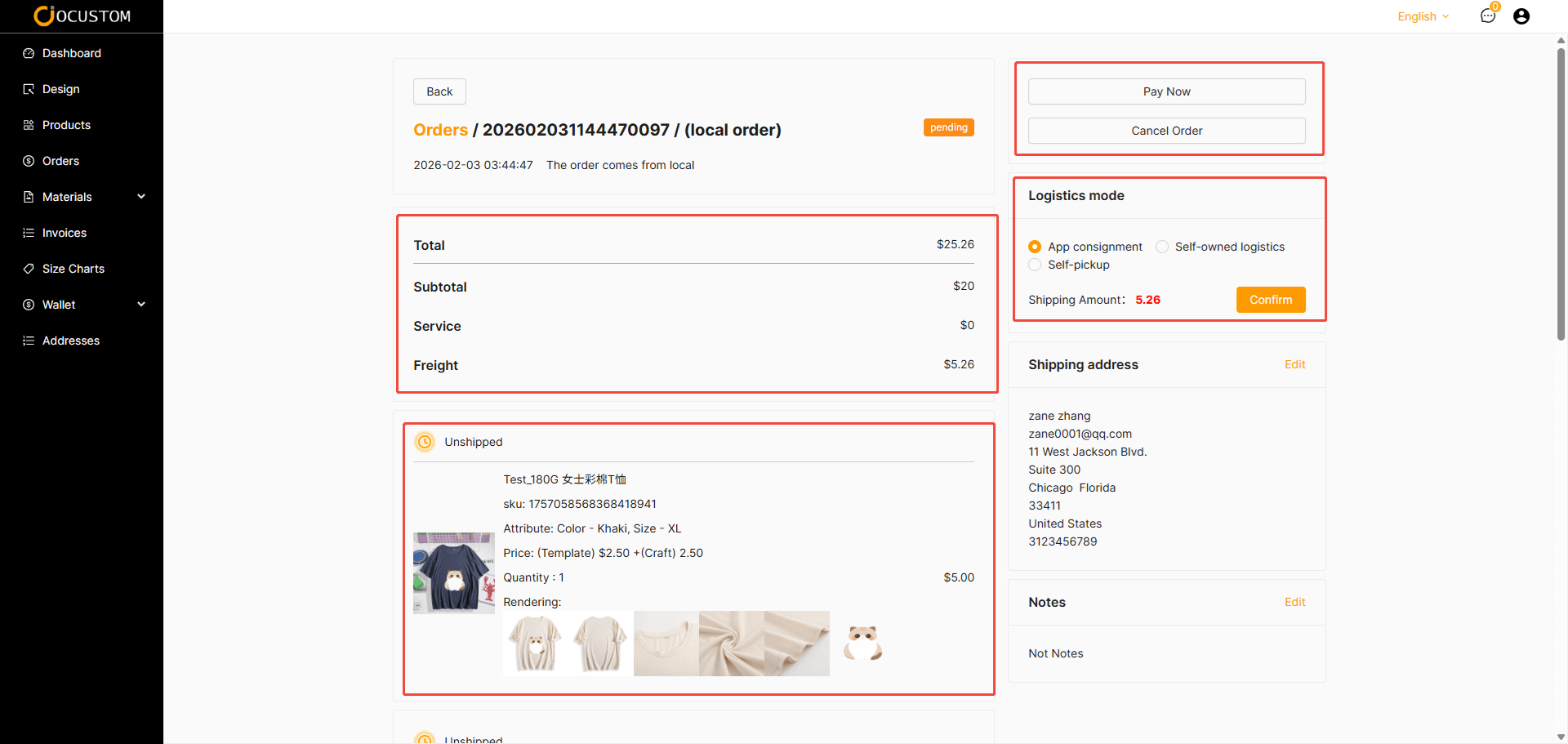 Click the View button to display the order details page, which includes the shipping method, custom product display, total amount, and order status section.
