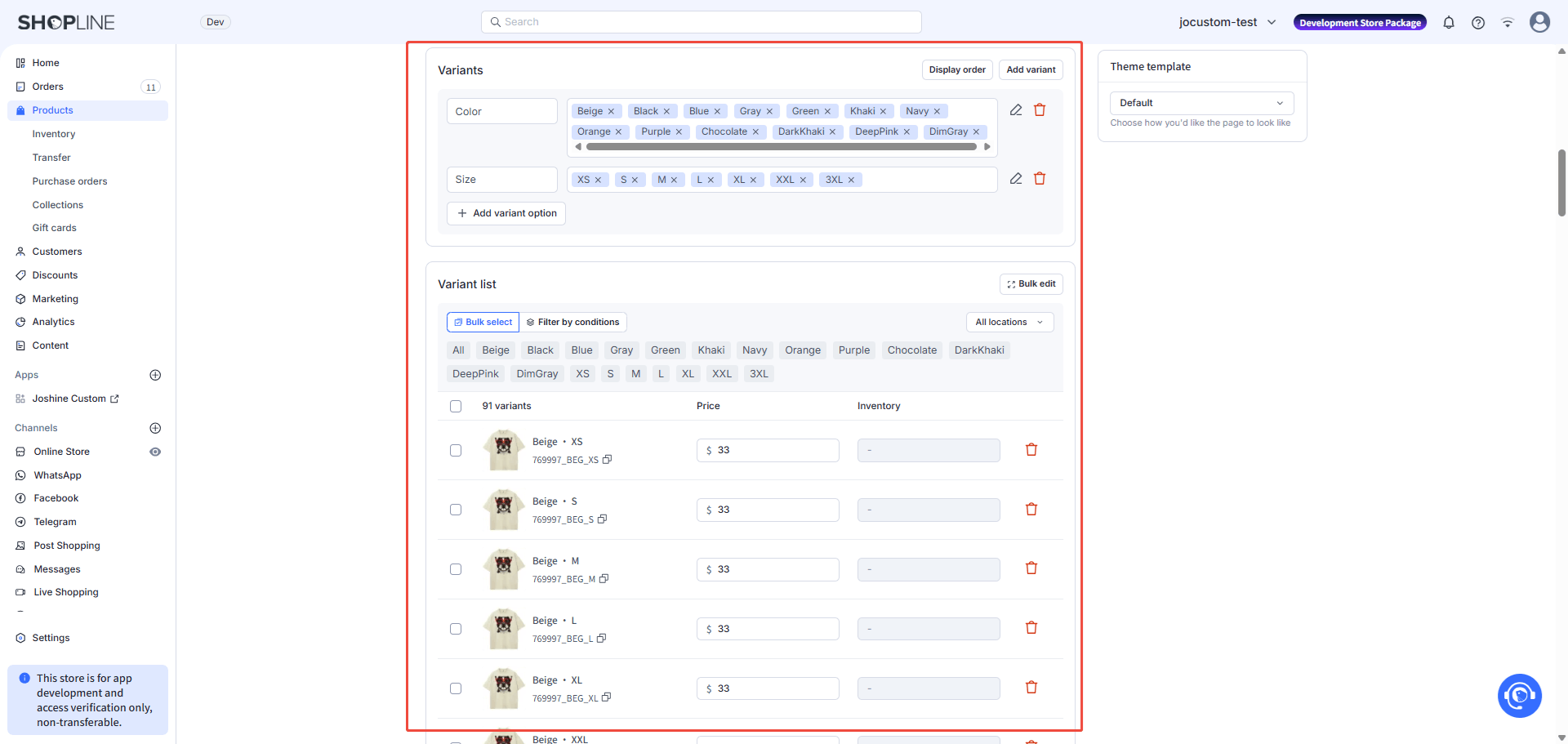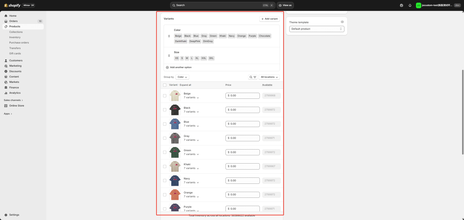 You can click on the color or size above to make bulk modifications to variant products sharing the same attribute.