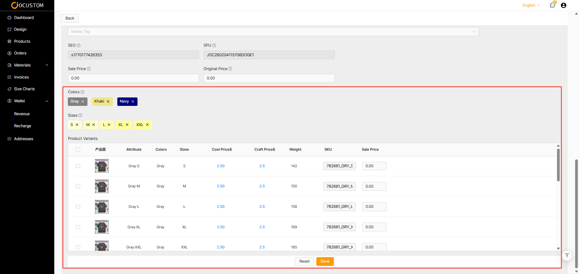 The list displays variant images, attributes such as color and size, along with base garment price, craftsmanship cost, product weight, SKU identifier, and the selling price for each variant.