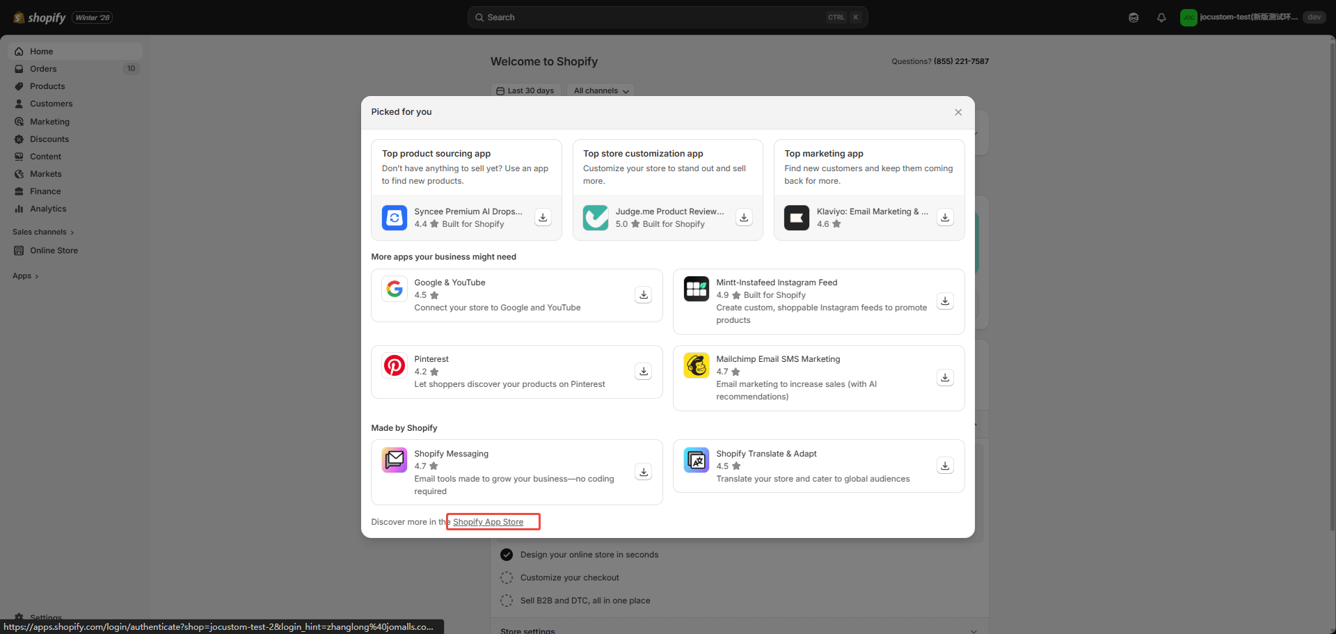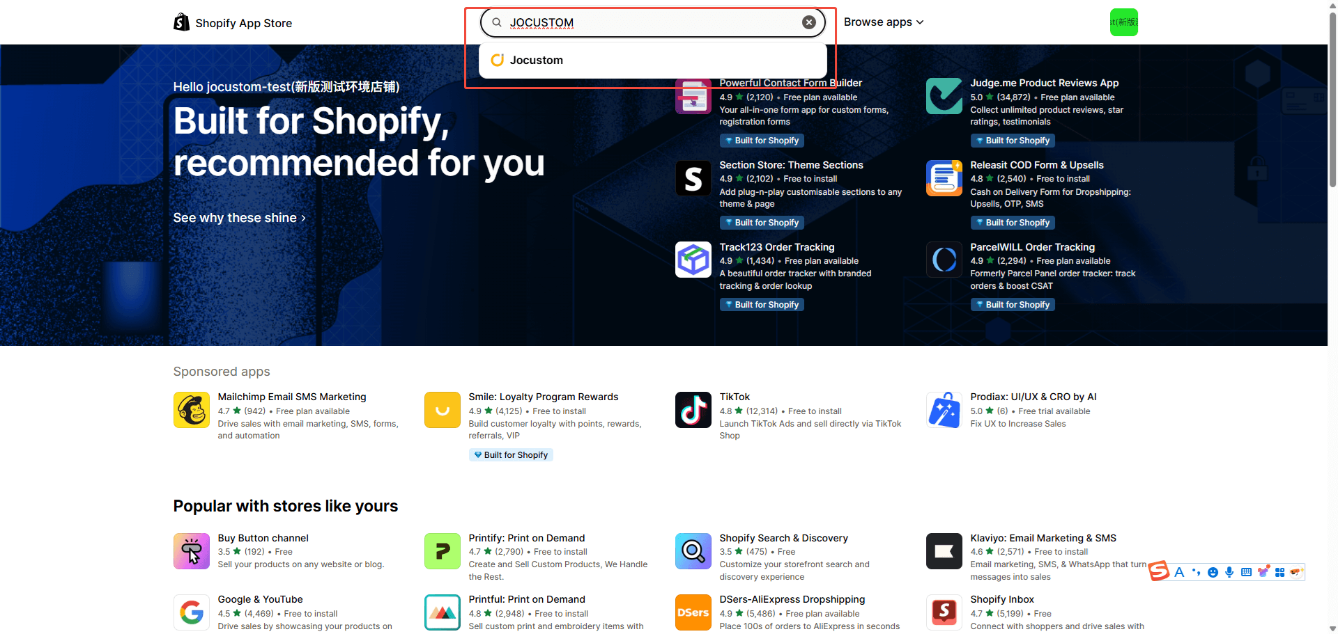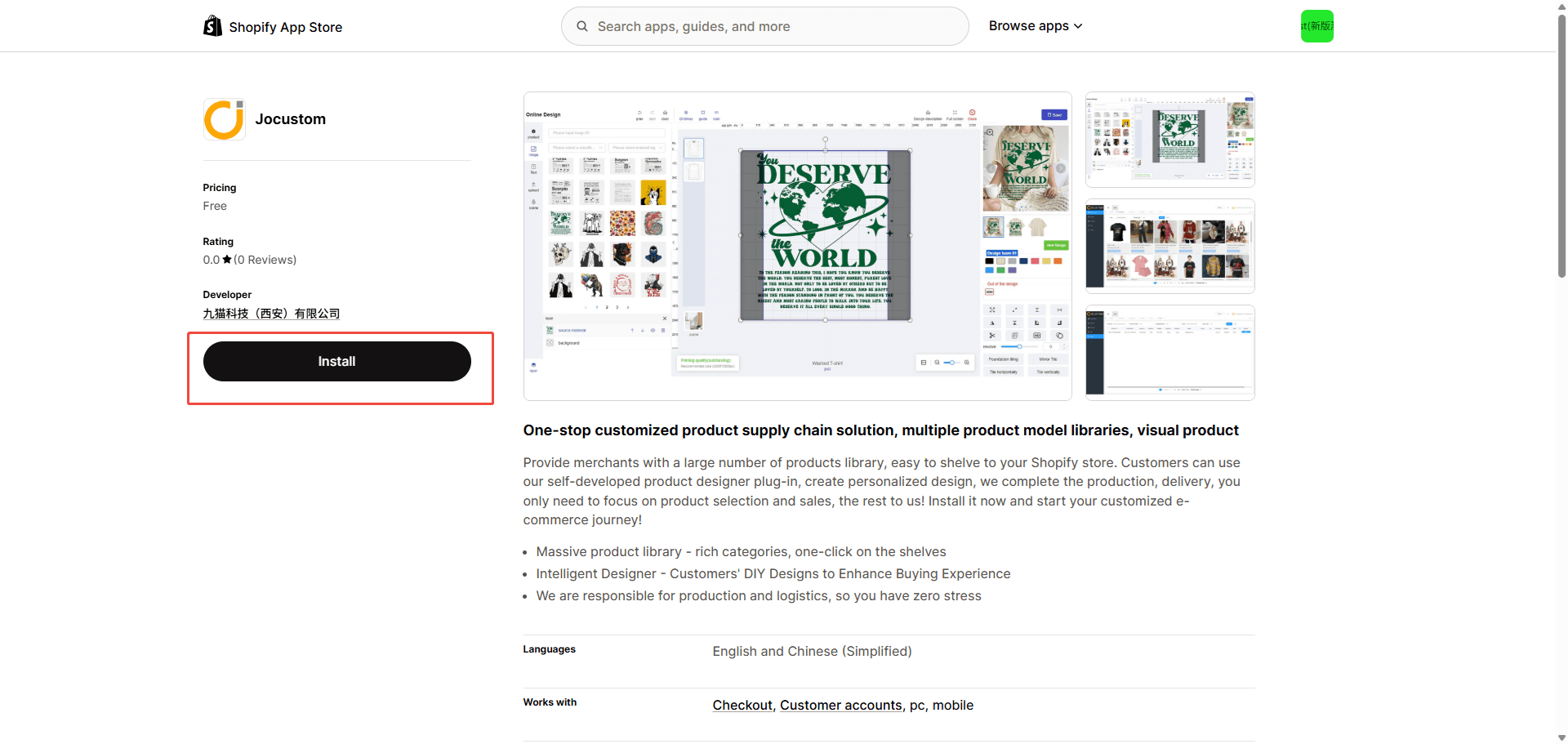This interface provides the complete process for installing the JOCUSTOM app on your Shopify store.